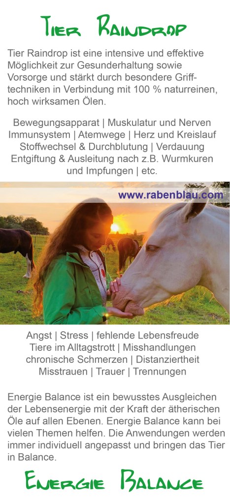 Die Animal Raindrop Technique ist eine einzigartige Massagetechnik für Körper und Geist. Inspiriert von der indianschen Tradition der Lakota entwickelte Gary Young die Raindrop Technique. Sie hilft den Körper, durch gezielte Massagen und spezielle Methoden zur Energiesteigerung, wieder in Balance und Harmonie zu bringen.